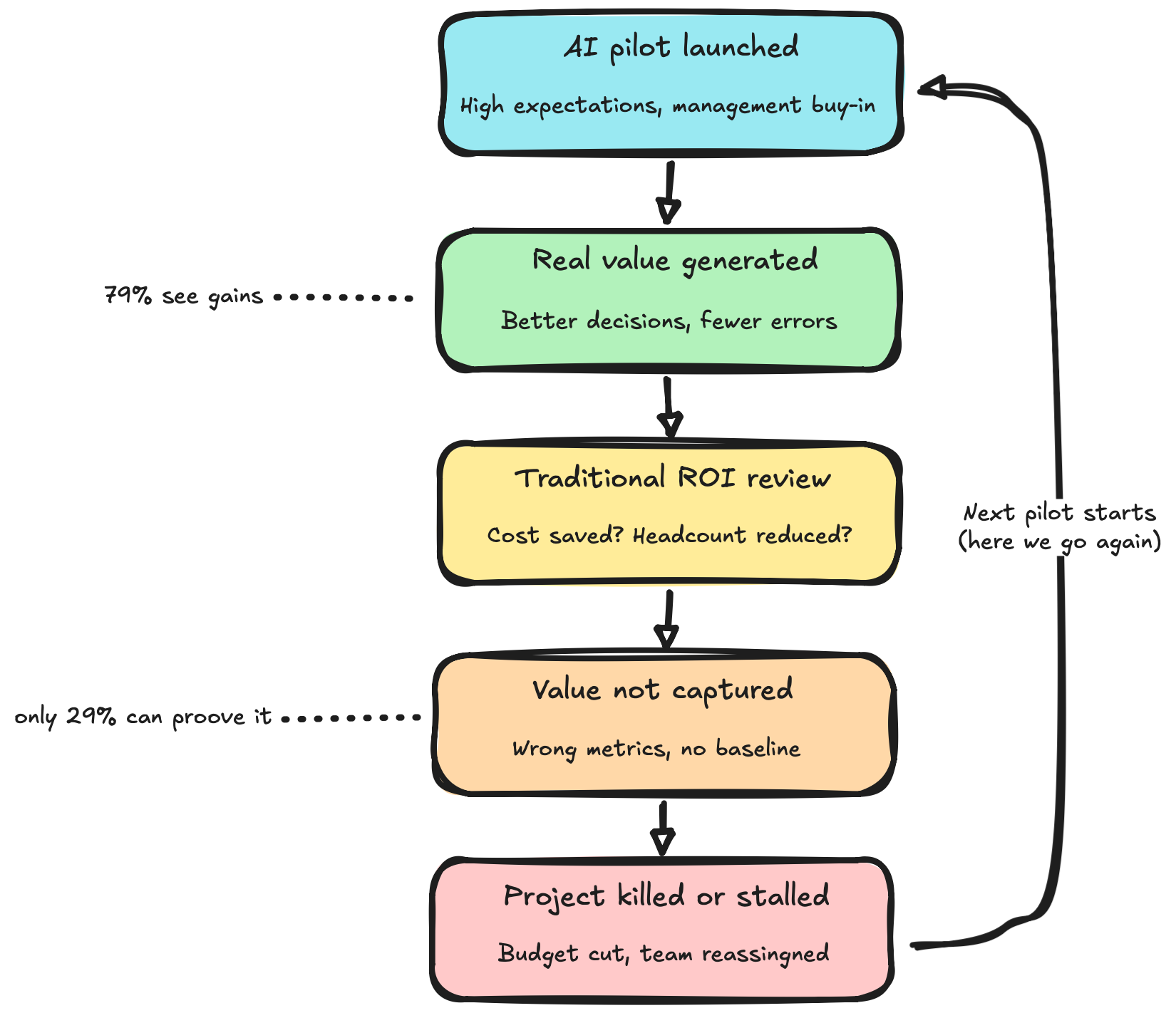 This creates a toxic dynamic. Leadership expects fast, visible returns. The measurement framework captures a fraction of the actual value. Projects delivering real impact get cut because the impact doesn't show up in the metrics being tracked. The organisation concludes "AI doesn't deliver ROI" when the real conclusion should be "we don't know how to measure AI ROI."